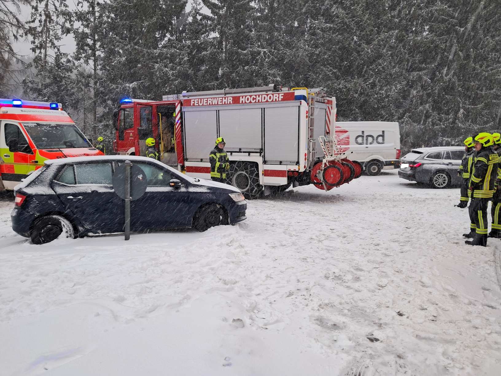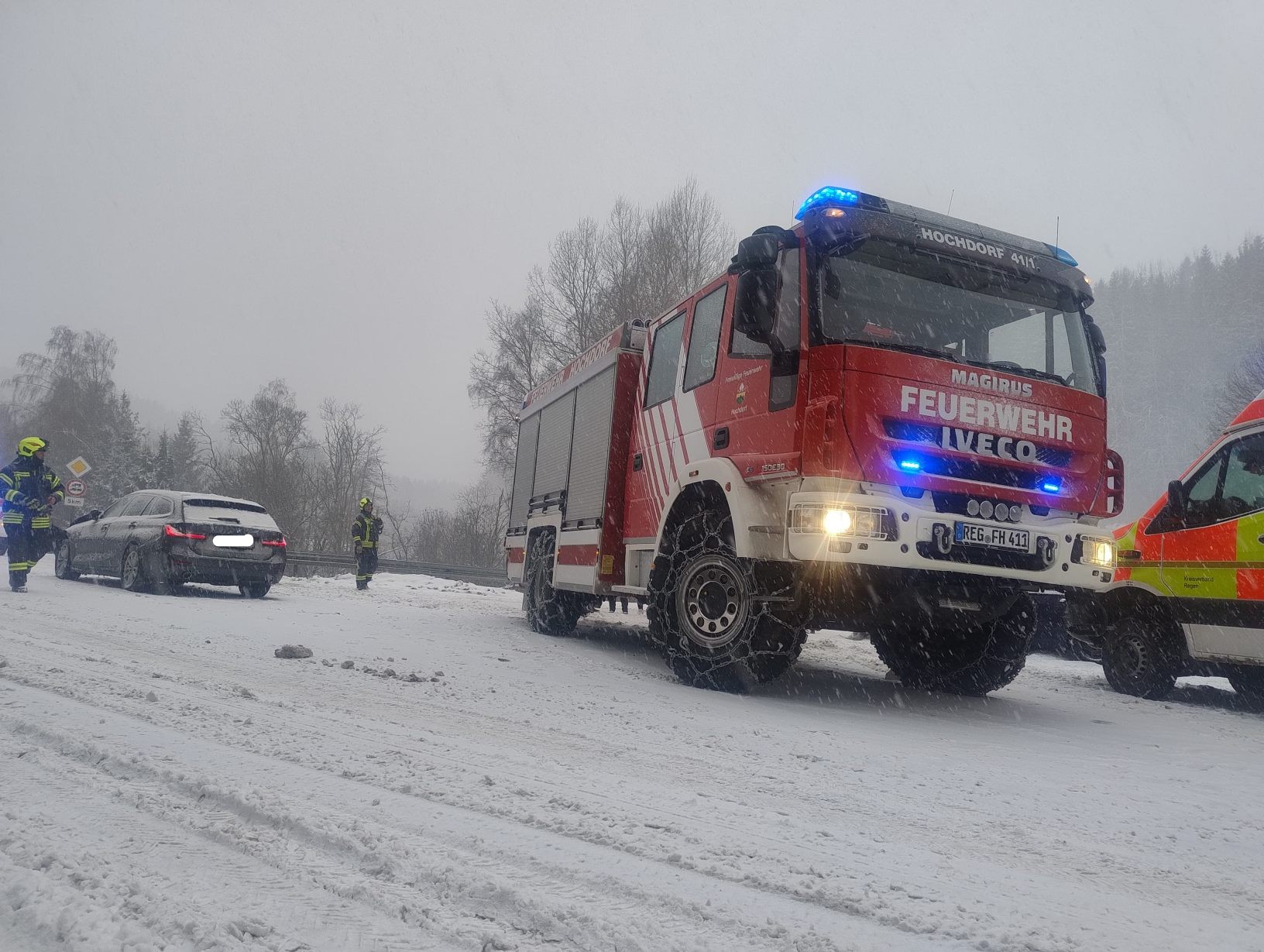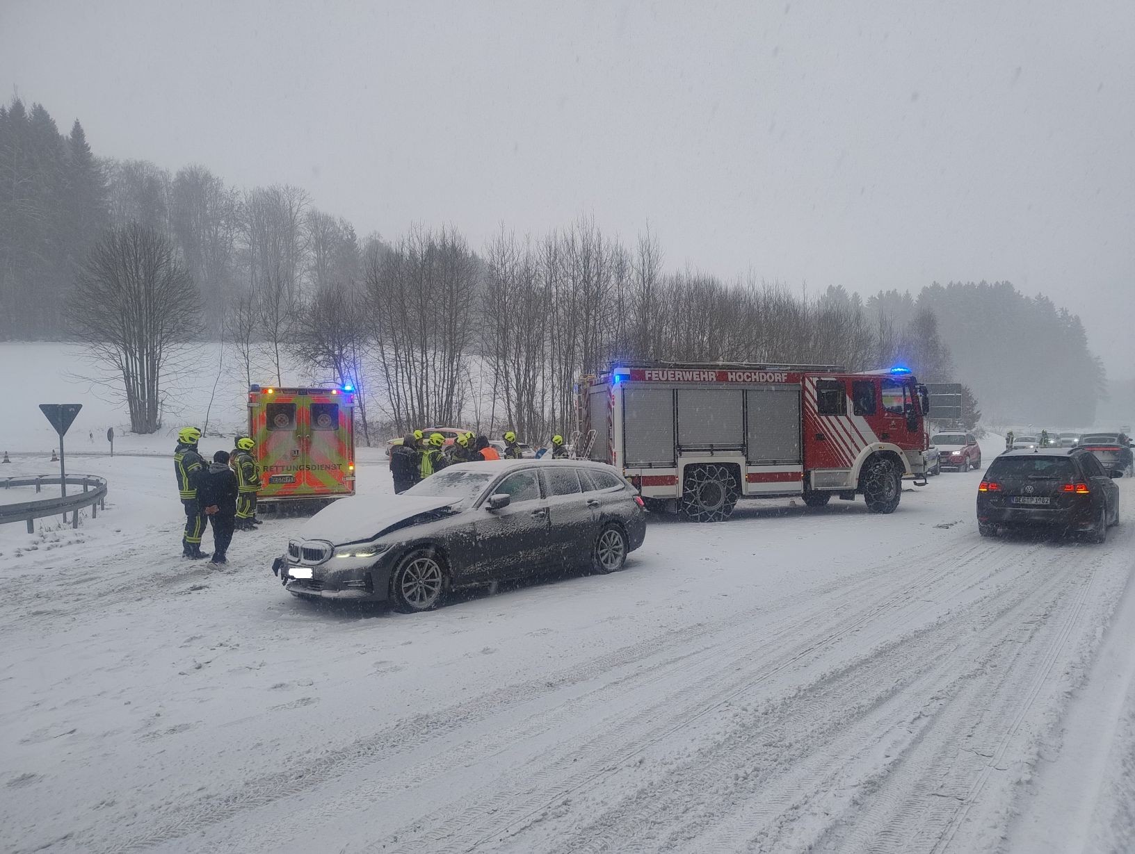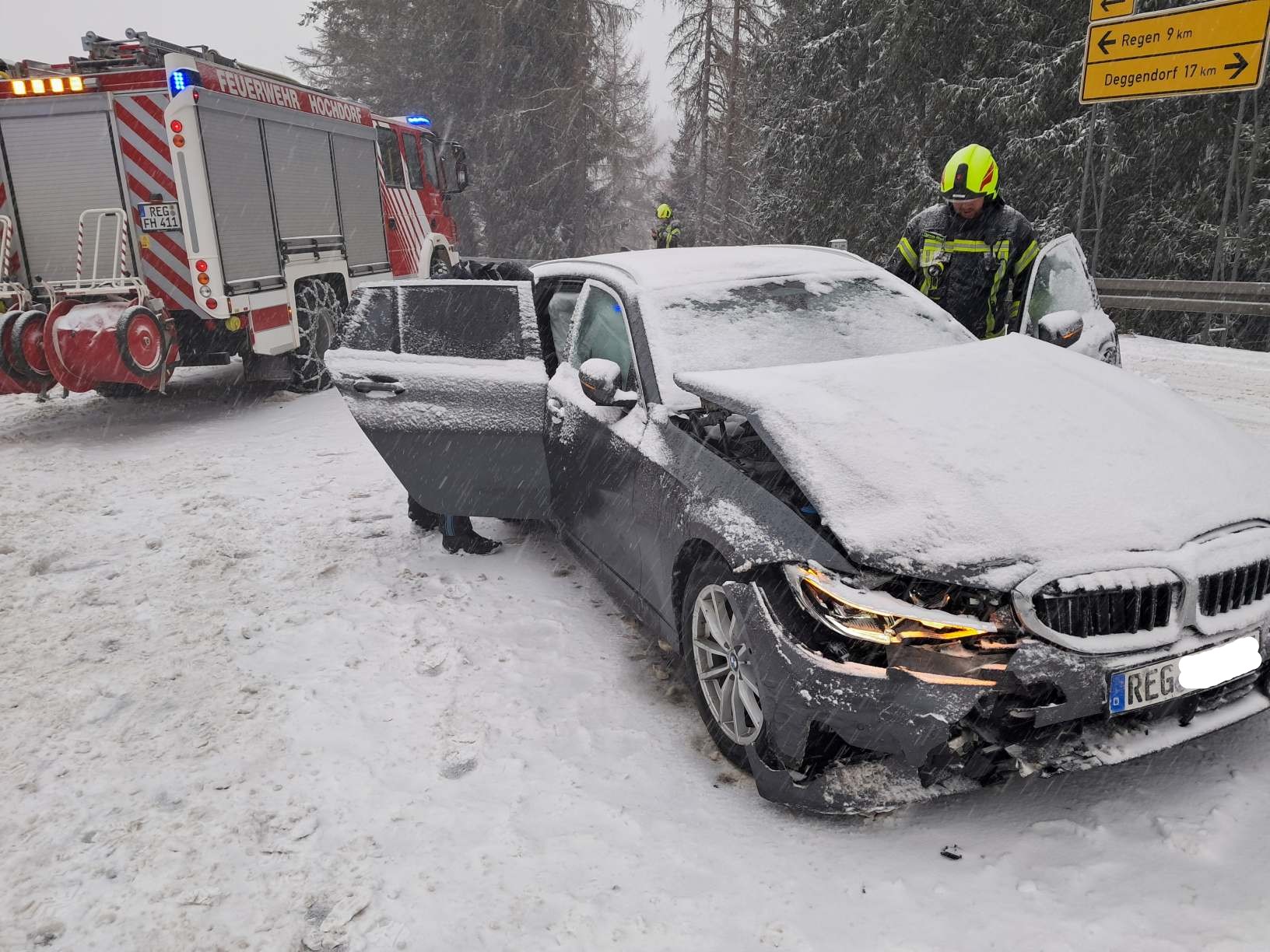 Birkenthal: Am Freitagvormittag ereignete sich bei winterlichen Straßenverhältnissen auf der Ruselstrecke bei der Abzweigung bei Birkenthal in der Gemeinde Bischofsmais ein Verkehrsunfall. Eine Frau aus dem Landkreis Deggendorf war mit ihrem Fahrzeug von Deggendorf her kommend unterwegs und wollte in Richtung Hochbruck abbiegen. Vermutlich hat die Frau ein entgegenkommendes Fahrzeug übersehen und es kam zum Zusammenstoß. Die beiden Fahrzeuge blieben im Kreuzungsbereich stehen. Fünf beteiligte Personen waren in den zwei Fahrzeugen und mussten zum Teil vom BRK versorgt werden. Die Integrierte Leitstelle in Straubing alarmierte die Feuerwehren Hochdorf und Bischofsmais an die Unfallstelle, genauso das BRK mit den Rettungswagen aus Rinchnach und Deggendorf. Die Feuerwehren übernahmen die Erstversorgung der Beteiligten und die Verkehrsregelung. Sie sperrten die Fahrtrichtung Deggendorf komplett und leiteten den Verkehr über Hochbruck wieder zurück auf die Staatsstraße 2135. Der Verkehr in Fahrtrichtung Regen wurde an der Unfallstelle vorbeigeleitet. Die eingesetzten Rettungskräfte des BRK kümmerten sich um die Verletzten. Die Feuerwehr schob beide Fahrzeuge nach der Unfallaufnahme zur nahen Salzhalle. Anschließend konnte der Verkehr wieder freigegeben werden. Die Feuerwehr Hochdorf war mit beiden Fahrzeugen und 24 Aktiven bis kurz nach 11 Uhr im Einsatz.
