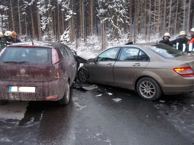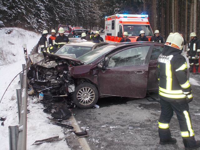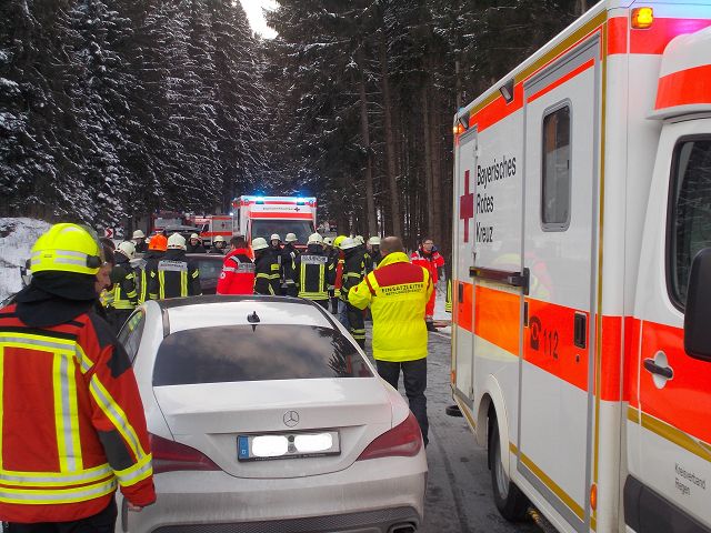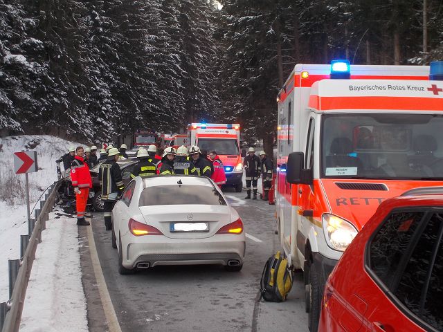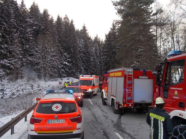 Folgenschwerer Frontalzusammenstoß auf der Staatsstraße 2135 nahe Reinhartsmais bei Regen: Eine 32-jährige Frau, die an der Unfallstelle noch reanimiert worden war, erlag zwei Stunden später im Krankenhaus ihren lebensgefährlichen Verletzungen. Die beiden weiteren Unfallbeteiligten, zwei ältere Leute aus dem Landkreis Regen, wurden schwer verletzt. Die Kollision hatte sich am Dienstag, gegen 14.50 Uhr, auf der Staatsstraße 2135, der Ruselstrecke zwischen Deggendorf und Regen, kurz vor der Ortschaft Reinhartsmais ereignet. Die Unfallstelle, die sogenannte "Zigeunerreibe", befindet sich in einem Waldstück. Wie einige Passanten an der Unfallstelle berichteten, soll die Straße in diesem Bereich glatt gewesen sein - wahrscheinlich wegen überfrierender Nässe. Polizeiangaben zufolge war eine 32-jährige Frau mit ihrem Pkw, einem Fiat Punto mit Freiburger Kennzeichen, auf der Ruselstrecke in Richtung Regen unterwegs. Kurz vor der Ortschaft Reinhartsmais geriet sie in einer Rechtskurve zuerst auf den rechten Seitenstreifen und schleuderte dann auf die linke Straßenseite. Dort prallte ihr Wagen frontal gegen einen aus Richtung Regen nahenden Mercedes, in dem sich ein 84-Jähriger und eine ältere Beifahrerin aus dem Landkreis Regen befanden. Durch die Wucht des Aufpralls wurde der Motorblock des Fiat in den Fahrgastraum geschoben. Die Frau wurde lebensgefährlich verletzt und schließlich reanimiert durch zwei Rettungssanitäter, die kurz nach der Kollision zufällig an der Unfallstelle eintrafen und deren Wiederbelebungsversuche erfolgreich waren. Gegen 17.30 Uhr erhielt jedoch die Polizei Regen die Nachricht, dass die Unfallverursacherin im Krankenhaus Deggendorf verstorben ist. Der 84-jährige Fahrer des Mercedes konnte durch Rettungskräfte aus dem schwer beschädigten Auto geborgen werden. Schwieriger gestaltete sich die Bergung der Beifahrerin, da der Mercedes durch den Zusammenprall an die Leitplanke geschoben worden war. Da mussten mehrere Feuerwehrleute kräftig Hand anlegen; unter Leitung von Kreisbrandrat Hermann Keilhofer konnte aber der Wagen von der Leitplanke weg gehoben und somit die eingeklemmte Frau befreit werden Den Gesamtschaden schätzt die Polizei auf rund 30.000 Euro. Bei diesem schweren Verkehrsunfall war ein großes Aufgebot an Rettungskräften sehr schnell vor Ort. Zum Einsatz kamen drei BRK-Rettungswagen, der Rettungshubschrauber Christoph Europa 3 aus Suben/Österreich sowie die Freiwilligen Feuerwehren aus Regen, Oberneumais, Bischofsmais und Hochdorf. Die Ruselstrecke blieb zweieinhalb Stunden lang gesperrt, der Verkehr wurde über Bischofsmais und Fahrnbach umgeleitet. Die Feuerwehr Hochdorf war mit beiden Einsatzfahrzeugen und 12 Aktiven an der Unfallstelle.